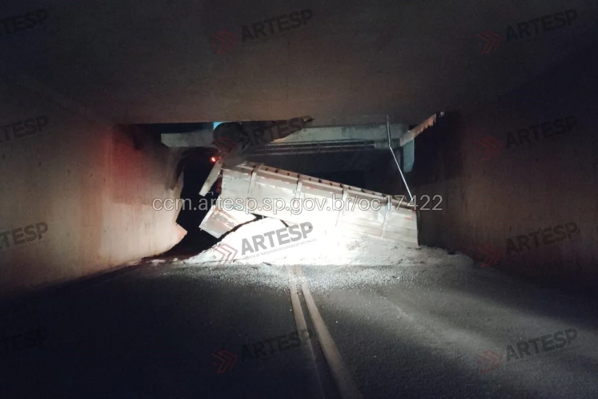 Uma carreta bitrem (caminhão com dois compartimentos de carga) ficou pendurada em um viaduto da Rodovia Anhanguera, na altura do município de Aramina, interior de São Paulo, após um acidente