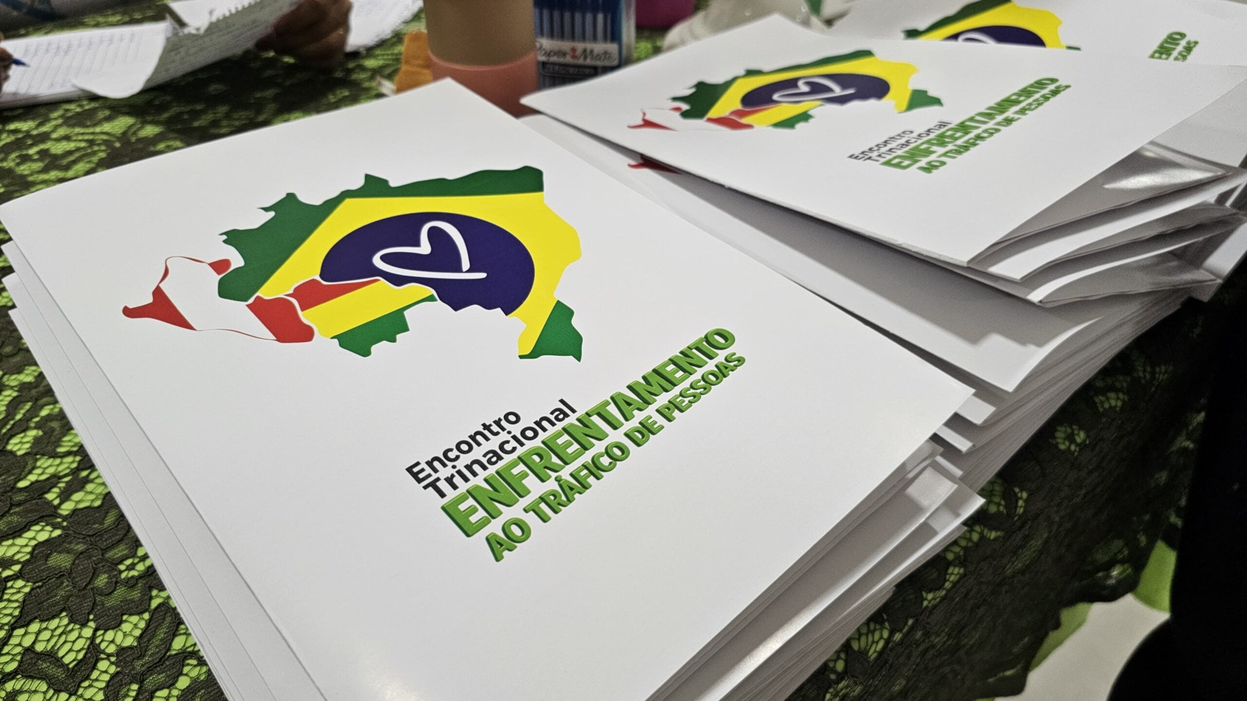 Representantes do Brasil, Peru e Bolívia participam do 1º Encontro Trinacional de Enfrentamento ao Tráfico de Pessoas, realizado no auditório da Secretaria de Estado de Educação (SEE), em Rio Branco,